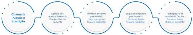 O processo de envio da Perspectiva do Paciente é simples, acessível e gratuito, e segue um fluxo definido pela Conitec. Inicialmente, são abertas chamadas públicas para inscrição de interessados, divulgadas no site da Comissão, mediante cadastro e login no portal gov.br. Os representantes são selecionados por sorteio público on-line e participam, obrigatoriamente, de encontros preparatórios, nos quais recebem orientações sobre a dinâmica da Comissão e organizam seu relato de experiência. A participação ocorre na primeira reunião de apreciação do tema pela Conitec, momento em que o representante apresenta seu depoimento, sem envolvimento em votações ou deliberações. As orientações completas sobre critérios, etapas e responsabilidades estão disponíveis no site da Conitec, na seção dedicada à Perspectiva do Paciente. A participação consciente e informada fortalece o processo de avaliação e contribui para decisões mais alinhadas às experiências e necessidades dos pacientes4.